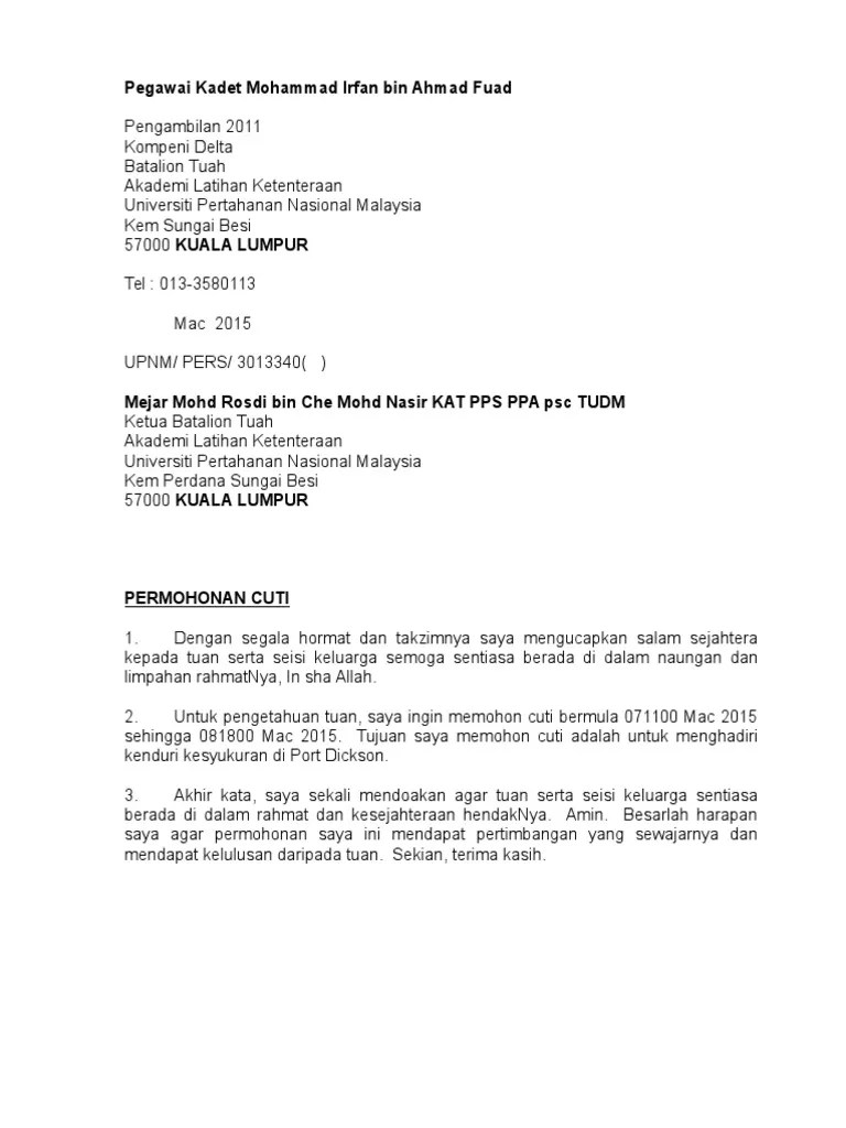 Ishak bin alang, f 410 kampung banggol, 09400 padang serai, kedah darul aman. Contoh surat mohon cuti sekolah kerana covid 19. Surat rasmi memohon cuti tanpa gaji surasmi k cute766. Contoh surat permohonan cuti malaysia picture put up ang published by admin that preserved in our collection. Surat permohonan cuti perkahwinan surasmi g cute766. Ishak bin md daud, guru tingkatan . Contoh surat rasmi memohon cuti kerana menghadiri perkahwinan kakak. Contoh surat pemohonan cuti untuk pelajar praktikal. Memohon izin melahirkan, yakni terhitung mulai hari senin tanggal 15 oktober 2018, sehingga membuat saya tidak bisa melaksanakan kewajiban dan . Namun, ada kalanya keadaan hidup memerlukan anda untuk memohon cuti lebih daripada 14 hari tanpa gaji.